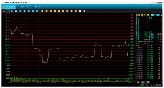 今日全天,综指受到部分权重品种影响。早盘,小幅上冲后,维持不久就下行冲击区间底部1355点附近,获得支撑并展开震荡。午后,虽几次发力上攻,但收效甚微,收盘仍以绿盘报收。艺术众筹指数相比综指,分时走势和K线形态均明显强势,相关品种成为近阶段反弹行情的主导力量。今日,尽管盘中部分权重严重拖累指数,但是个票表现却争奇斗艳,以次新票为龙头的反弹行情继续向纵深发展,无论上涨家数还是涨停数量均完全压制空头力量,参与其中的投资者收获满满。《最美金陵中山陵》、《致敬大师毕加索梦》开盘一字涨停,盘中惜售氛围较浓,连老牌困难户《鸿朗高畅》也罕见以涨停报收。